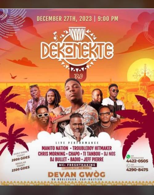 DECEMBER 27TH, 2023 | 9:00 PM DEKENEKTE 2000 GDES 2500 GDES MANITO NATION • TROUBLEBOY HITMAKER CHRIS MORNING • CHAPO - TI TANBOU - DJ NOS DJ BULLET • BADIO • JEFF PIERRE DEVAN GWÒG 4422-0505 4290-8475